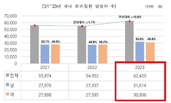 신규 희귀질환자는 2022년(5만4천952명)에 1년 전보다 1.7% 줄었으나, 2023년에는 13.6% 늘었다.