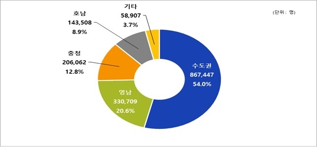 등록외국인의 54.0%는 수도권에 거주하고 있으며, 영남권(20.6%), 충청권(12.8%), 호남권(8.9%)이 뒤를 이었다.