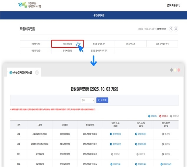 국가정보자원관리원(국정자원) 화재 여파로 온라인 화장예약 시스템 'e하늘장사정보시스템' 접속 이 제한되는 가운데, 보건복지부가 국민 불편을 최소화하고자 전국의 화장장 예약 접수현황 정보를 통합 제공하는 임시 홈페이지를 가동한다고 3일 밝혔다.