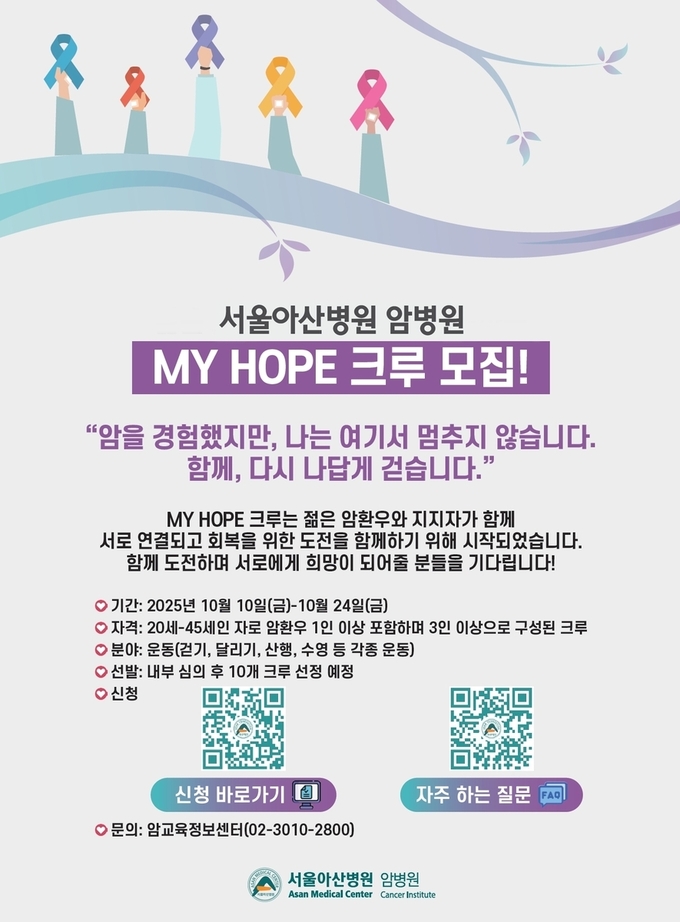 서울아산병원은 젊은 암 환자들이 건강을 지키고 같은 투병 경험을 가진 이들과 소통해 신체·정신적으로 회복할 수 있도록 또래 운동 모임인 '마이 호프(MY HOPE)'를 오는 24일까지 모집한다 고 20일 밝혔다.
