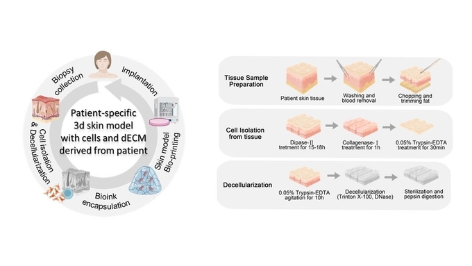 환자 피부에서 세포를 제거한 탈세포화 세포외기질을 만들고 각질형성세포, 섬유아세포와 함께 3D 바이오프린팅 기술로 재조합했다.