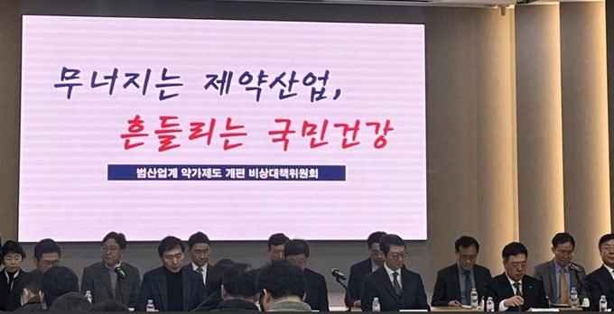 한국제약바이오협회, 한국바이오의약품협회, 한국의약품수출입협회, 한국신약개발조합, 한국제약협동조합 등으로 구성된 '제약바이오산업 발전을 위한 약가제도 개편 비상대책위원회'는 최근 서초구 제약바이오협회 본사에서 기자회견을 열었다.