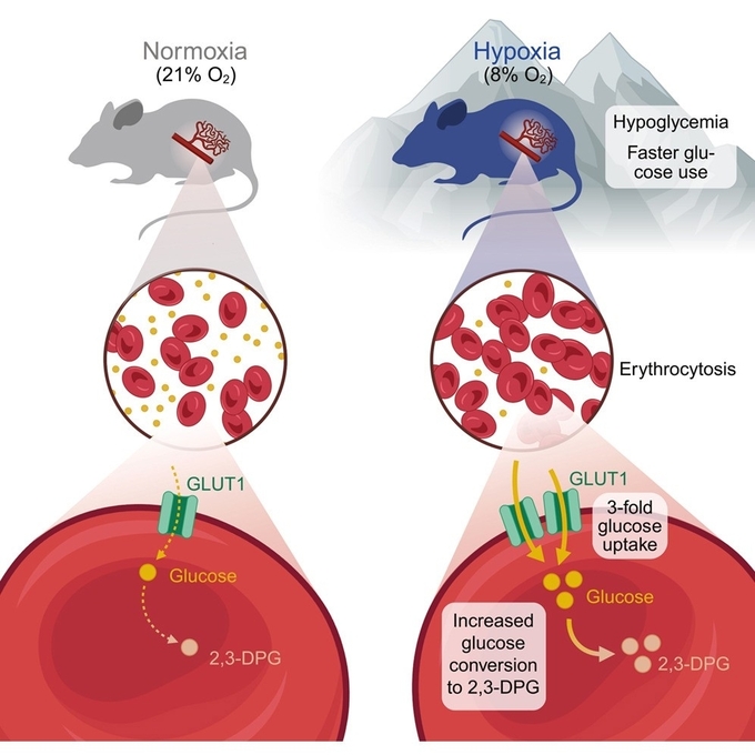 연구팀은 생쥐가 저산소 환경에 놓이면 적혈구가 혈류에서 포도당을 흡수하도록 대사가 전환된다며 이런 적응은 조직 전반에 산소를 더 효율적으로 전달하고 동시에 혈당 수치를 낮추는 유익한 부수 효과도 나타낸다고 말했다.