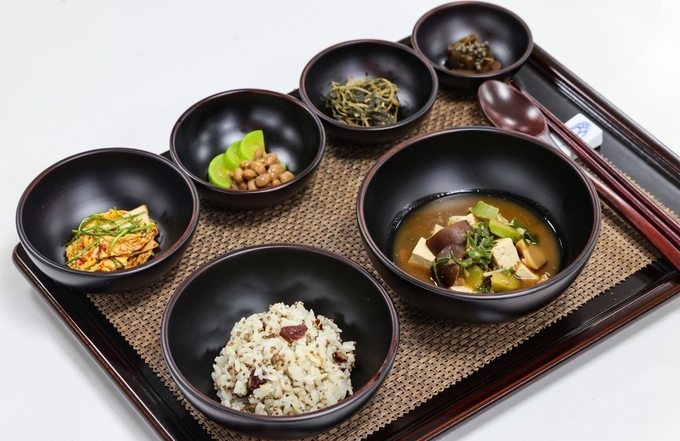 일반 식당에서 흔한 배추겉절이도 나왔다. 제철을 맞은 세발나물과 파프리카, 홍시가 앙증맞게 곁들여진다. 그런데 위에 뿌리는 새콤한 향의 무언가는 생소하다. 다시마 식초였다. 감칠맛을 돋운다. 두꺼운 건다시마에 현미식초와 설탕을 넣어서 1년간 숙성시킨 것이다. 여름에는 물에 희석해 음용하기도 한단다. 장 만들기와 함께 다양한 식초 만들기는 교육관에서 스님이 가르치는 핵심 과정이다.