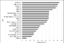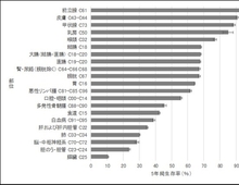 일본 암 환자의 5년간 생존율이 다발성골수종, 전립선암, 악성림프종 등에서는 높아졌지만 담낭암, 담관암, 췌장암 등에서는 큰 변화가 없던 것으로 조사됐다. 22일 일본 국립암연구센터가 홈페이지에 공개한 2012~2015년 암 진단 환자의 5년 생존율 분석 자료에 따르면 15세 이상 암 환자의 5년 생존율은 위암 63.5%, 대장암 67.2%, 폐암 35.5% 등이었다. 이번 분석에는 44개 도도부현의 254만7천명의 자료가 사용됐다. 15세 미만의 경우 배세포성종양이 94.5%, 망막아세포종이 94.6%로 높았다. 그러나 중추신경계나 척수 종양은 57.1%로 낮았다. 1993~1996년 조사 당시와 비교하면 남성의 경우 다발성골수종, 전립선암, 악성림프종 등에서, 여성은 악성림프종, 다발성골수종, 폐암, 백혈병 등에서 생존율이 15.5~34.9% 포인트 상승했다. 반면 담낭, 담관, 췌장암의 경우 큰 변화가 없었다. 여성의 경우 구강암, 인두암의 생존율은 낮아진 것으로 나타났다. 조기 발견의 중요성도 재확인됐다. 전이되기 전에 치료할 경우 위암의 5년 생존율은 92.4%, 대장암은 92.3%, 폐암은 77.8%로 나타났다. 여성 유방암은 98.4%에 달했다.