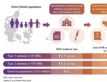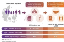 제1·제2형 당뇨병 환자의 급성 심장사(Sudden Cardiac Death) 위험이 일반인구보다 3.7배와 6.5배 높고, 이로 인해 기대수명도 3.4년과 2.7년씩 짧아진다는 연구 결과가 나왔다. 덴마크 코펜하겐대 병원 토비아스 스키엘브레드 박사팀은 유럽 심장 저널(European Heart Journal)에서 2010년 덴마크 전체 인구 데이터에서 모든 급성심장사를 분석, 당뇨병 환자와 일반인구의 위험을 비교해 이런 결과를 얻었다고 10일 밝혔다. 스키엘브레드 박사는 "급성심장사가 당뇨병 환자에게 더 자주 발생하고 기대수명 단축에도 상당한 영향을 미친다는 것을 확인했다"며 "급성심장사 위험 증가는 비교적 젊은 당뇨병 환자에게서 가장 뚜렷하게 나타났다"고 말했다. 급성심장사는 심장에 문제가 생겨 갑자기 사망하는 경우로, 젊고 겉보기에 건강한 사람에게는 드물게 일어난다. 일반인구에서도 급성심장사는 중요한 공중보건 과제이고 현재 예방 전략은 심혈관 질환이 있는 고위험 환자에게 초점이 맞춰져 있다. 연구팀은 이 때문에 당뇨병 환자 같은 다른 취약 집단은 상대적으로 충분히 다뤄지지 않고 있다며 당뇨병 환자는 급성심장사 위험이 높은 것으로 알려져 있지만 위험 수준