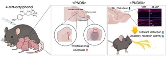 부산대학교 연구진이 '환경호르몬'으로 알려진 내분비계 교란물질에 산모가 임신기 및 수유기에 노출되면 자손의 정상적인 후각 신경 발달을 방해할 수 있다는 연구 결과를 발표했다. 부산대는 분자생물학과 정의만 교수 연구팀이 임신 중 초기 신경 발달 시기의 내분비계 교란물질 노출이 후각 신경 및 후각 신경의 기원인 뇌실하 영역에서 세포사멸을 일으키는 것을 발견하고 그로 인해 냄새 탐지 능력이 감소할 수 있음을 확인했다고 4일 밝혔다. '내분비계 교란물질'은 체내 호르몬의 정상 기능을 교란할 수 있는 화학물질이다. 이 물질은 우리가 흔히 접하는 화장품, 캔, 플라스틱, 페인트, 의약품에서 광범위하게 사용되는데, 인간에게 무분별하게 노출되면서 건강에 부정적인 영향을 미치는 것으로 보고돼 왔다. 정 교수팀은 알킬페놀 계열의 내분비계 교란물질인 옥틸페놀이 마우스의 후각 신경에 미치는 영향을 조사해 내분비계 교란물질이 후각 신경에도 영향을 줄 수 있음을 규명했다. 이번 연구는 뇌 발달이 활발히 진행되는 임신기부터 수유기까지 어미 마우스에 옥틸페놀을 투여해 자손 마우스가 옥틸페놀에 노출되도록 했으며, 이를 성체가 될 때까지 사육하며 영향을 분석했다. 정 교수는 "이번 연구를