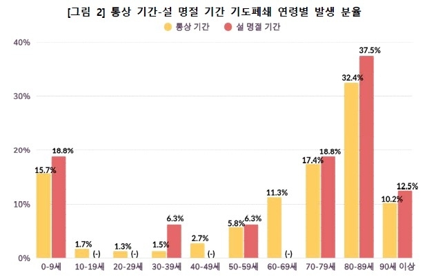 연령별로 봤을 때 80∼89세 고령층이 37.5%로, 설 연휴 전체 기도 폐쇄 사례에서 가장 큰 비중을 차지했다.
