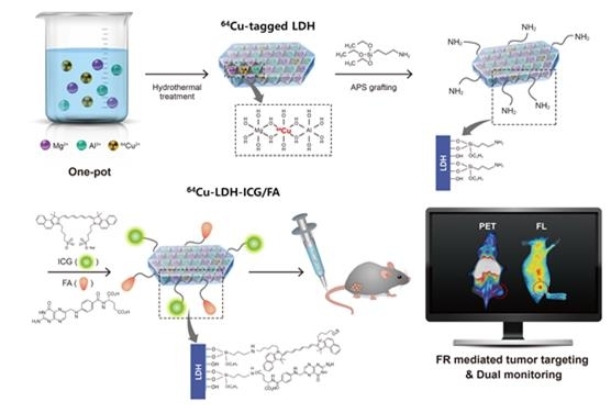 연구팀은 층상이중수산화물(LDH) 나노 물질을 토대로 PET 진단용 방사성동위원소인 구리-64와 NIRF 촬영용 형광 물질인 인도시아닌 그린(ICG), 암세포를 찾아가는 표적 물질인 엽산(FA)을 결합한 나노플레이트를 개발했다.