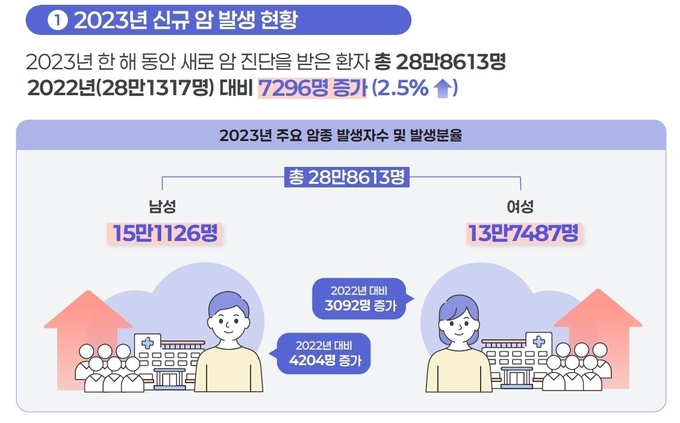 2023년 기준 암 유병자는 273만2천906명(남자 119만3천944명·여자 153만8천962명)으로, 1년 전보다 5.6% 늘었다.