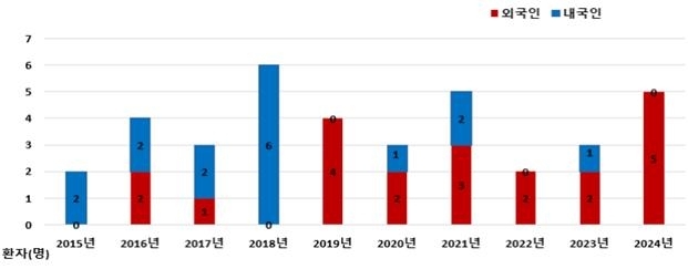 국내 한센병 신규 환자는 지난해 기준 내국인 1명, 외국인 2명 등 3명이다. 2024년에는 외국인 환자만 5명이었다가 감소했다. 작년 내국인 환자 1명은 남태평양 지역에서 장기간 체류한 것으로 확인됐다.
