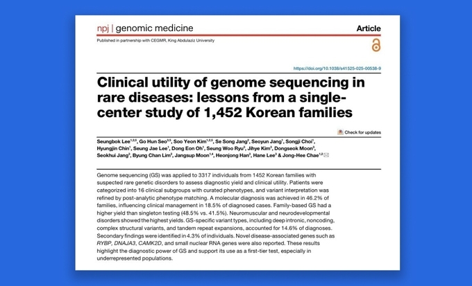 AI 기반 희귀 유전질환 진단 기업 쓰리빌리언은 서울대병원 희귀질환센터와 공동으로 수행한 국내 최대 규모의 희귀질환 전장유전체분석(WGS) 임상 연구 결과가 세계적인 학술지 네이처의 유전체의학 분야 전문 학술지인 'npj Genomic Medicine'에 게재됐다.