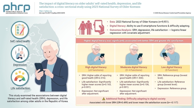 15일 질병관리청에 따르면 '2023년 노인실태조사'에 참여한 65세 이상 노인 9천951명을 대상으로 디지털 문해력(Digital Literacy)과 삶의 만족도, 자가 건강 상태 사이의 연관성을 분석한 결과 이 같이 나타났다.