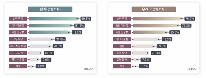 의료 AI의 한계는 의료사고 발생 시 법적 책임의 불명확성(경험 의사 69.1%·비경험 의사 76.0%) 이 1순위로 꼽혔다.