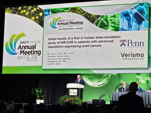 HLB이노베이션 자회사 베리스모 테라퓨틱스가 고형암 CAR-T 치료제 'SynKIR-110' 임상 1상(STAR-101) 중간 결과를 미국암연구학회(AACR 2026)에서 구두 발표해 호응을 얻었다.