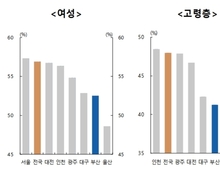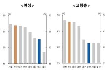 부산이 2021년 특·광역시 가운데 가장 먼저 초고령사회(65세 이상 인구 20% 초과)에 진입하고 이후 고령화 진행 속도도 가장 빠르지만, 여성과 고령층의 경제활동참가율은 전국 최하위권인 것으로 나타났다. 한국은행 부산본부 경제조사팀 곽승주 과장, 금정현 조사역, 이유경 청년인턴이 발표한 '최근 부산지역 고용상황 평가 및 시사점' 조사연구보고서에 따르면, 지난해 부산의 60세 이상 고령층 비율은 36.7%로, 전국 7개 특·광역시 가운데 가장 높다. 15세 이상 인구 가운데 여성이 차지하는 비율도 52.1%로 서울(52.75)에 이어 두 번째로 높다. 그러나 여성과 고령층의 경제활동참가율은 각각 52.5%와 41.2%로, 전국 17개 시도 가운데 각각 16위와 15위에 그쳤다. 주당 평균 15시간 미만 근무하는 초단시간 근로자 비중도 7.4%로 전국 평균 6.2%를 웃돌았다. 보고서는 "부산지역은 고령인구 비중이 높고 그 증가 속도 또한 빠르므로 향후 생산가능인구 감소와 그에 따른 노동공급 감소 가능성이 우려되는 상황"이라며 "장기적 노동공급 기반 확충을 위해 여성 및 고령층 경제활동참가율을 높이고, 청년 유출을 완화하기 위해 청년층 선호 일자리 확보가 필