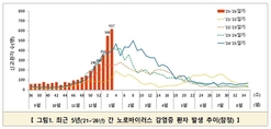 질병관리청은 24일 노로바이러스 감염증 발생이 10주 연속 증가하는 가운데 영유아 환자 비중도 늘고 있다며 예방수칙 준수를 당부했다. 210개 병원급 장관감염증 표본감시 결과 노로바이러스 감염증 환자 수는 작년 11월 1주(2025년 45주)부터 계속 늘어 1월 3주까지 10주 연속 증가세를 기록했다. 특히 1월 3주 기준 전체 환자 가운데 0∼6세 영유아 비중은 51.1%로 전주(217명 39.6%) 대비 11.5%포인트 높아졌다. 7∼18세 환자는 19.3%, 19∼49세 환자는 14.4%를 차지했다. 노로바이러스는 바이러스에 오염된 물(지하수) 혹은 음식물(어패류 등)을 섭취한 경우에 감염된다. 환자와 접촉하거나 환자 구토물의 비말에 노출됐을 때도 감염될 수 있다. 일단 감염되면 12∼48시간 안에 구토·설사 등의 증상이 발생하며 사람에 따라 복통·오한·발열이 나타나기도 한다. 노로바이러스는 감염력이 매우 강하고 일상적인 환경에서도 사흘간 생존할 수 있다. 또 바이러스 유전자형이 다양하고 감염 후 면역을 유지하는 기간이 최대 18개월 정도로 짧아 과거에 감염됐더라도 재감염될 수 있다. 감염된 환자는 증상이 사라진 후 48시간까지 등원·등교와 출근을 자제